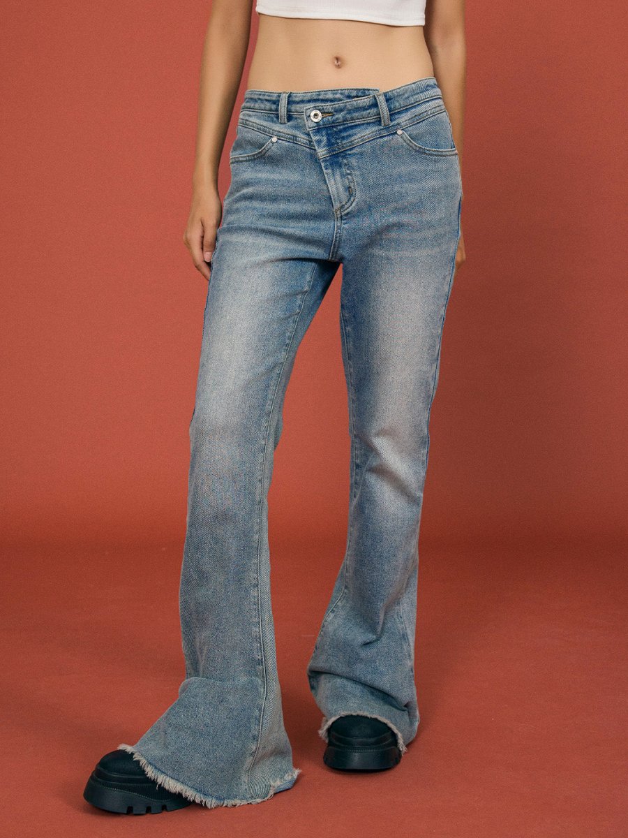 A playful twist on classic denim—these flared hem jeans blend retro edge with modern comfort. Lightweight stretch fabric hugs the waist while keeping your silhouette long and sleek.